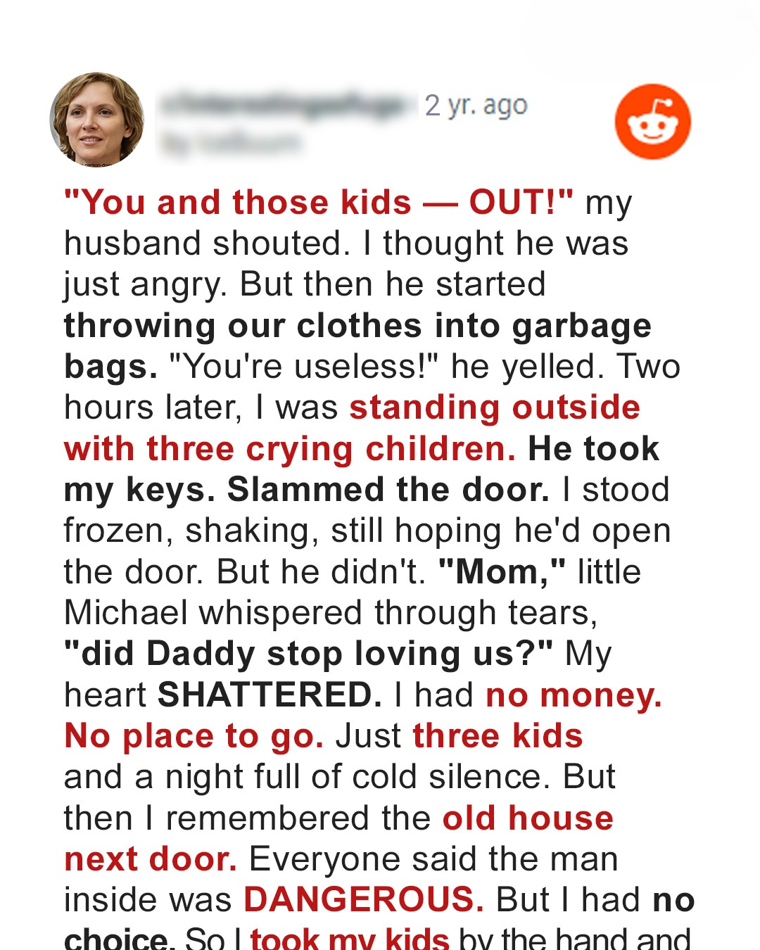 Michael tugged at my sleeve. Tears ran down his face. “Mom, why did Dad throw us out?”