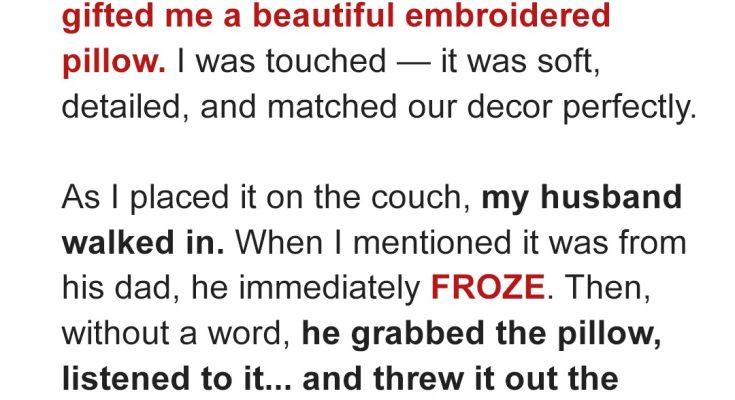 Until I took a pair of scissors and cut through the thick tape. Opening the package, I found a beautifully embroidered pillow, a note sticking out beneath it. It would have matched our living room décor perfectly.