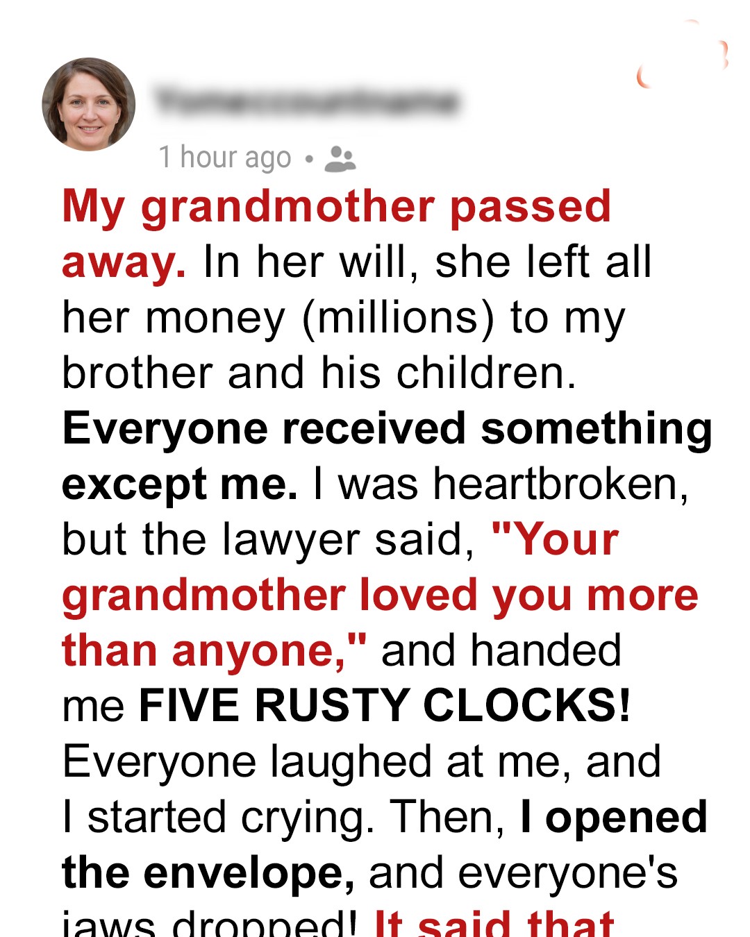 A greedy brother inherits a house and mocks his younger sister, who only gets five rusty old clocks from their late grandmother. Little did they know about what was hidden in those timepieces.“Oh, so grandma called you as well?! I thought you’d be busy in the library…like a good little bookworm!” 26-year-old Brian scoffed at his younger sister Linda, 19.She had just stepped down from the taxi. Fear filled her eyes as her heart told her: “Nothing will happen to grandma. She’ll be fine. She’ll live for a hundred years more.”