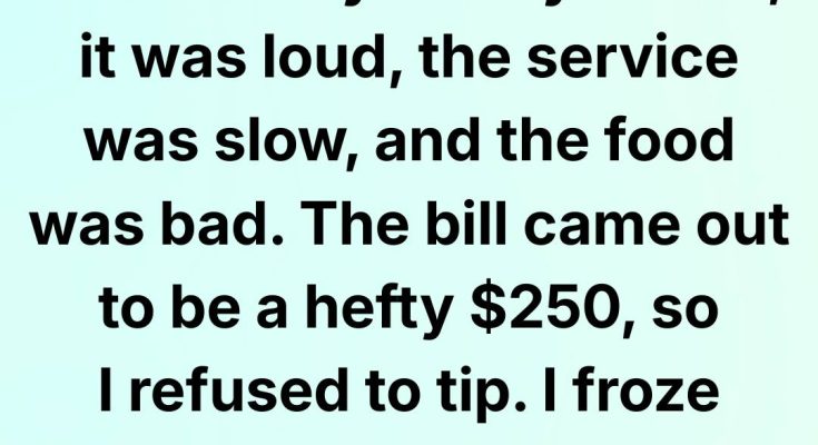 Then, as quickly as she’d leaned in, she straightened up, her face a mask of polite neutrality. She handed him the card and receipt, thanked us, and walked away.