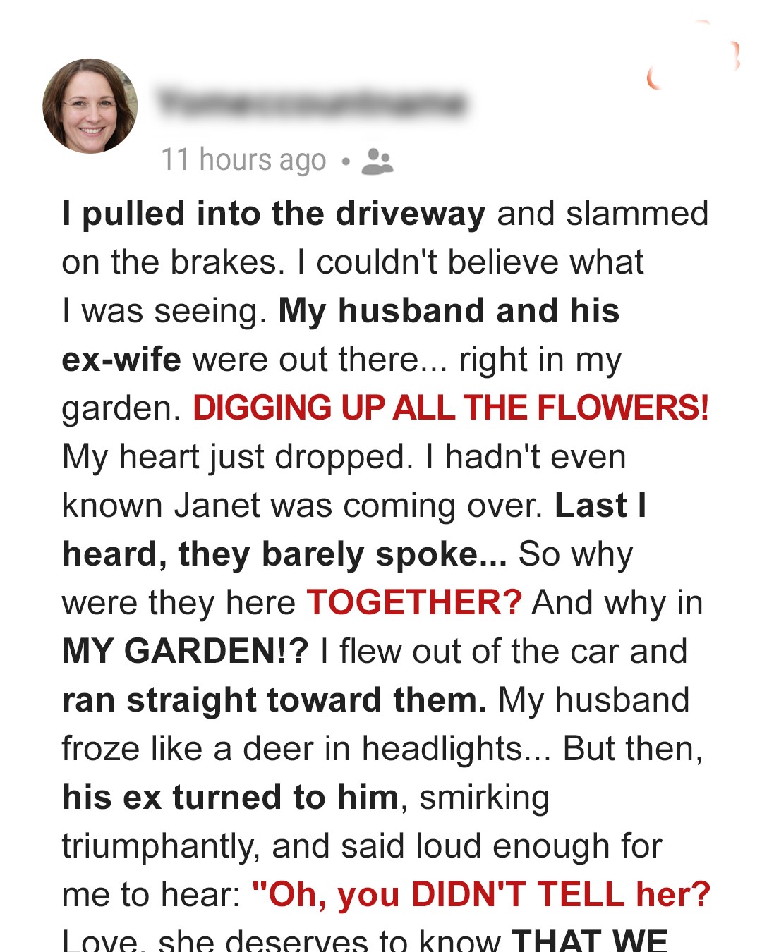Margaret never expected to come home to find her husband, Martin, frantically digging up their beautiful garden alongside his ex-wife. Their hushed whispers and dirt-stained hands hinted at long-buried secrets. Upon confrontation, Margaret realized Martin wasn’t as perfect as she thought.I’ve heard of men cheating on their wives with their colleagues, friends, and even exes, but I never thought I’d be forced to think like that about my husband, Martin. I always thought he was the perfect man I could’ve asked for.