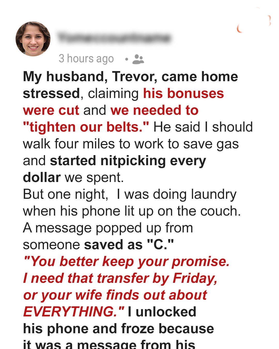 “Do you really need the good laundry detergent?” That’s how it started. Small things. Innocent things. I thought Trevor was just stressed after his company cut bonuses. But looking back… that was the first crack in everything I thought we had.I used to think love was about compromise.Give a little, take a little — that’s what marriage was supposed to be, right? For the first two years, Trevor and I did just that. I had my career in marketing, the apartment my grandmother left me (a sweet little place with sun-soaked windows and creaky floors), and a decent emergency fund. Trevor worked in logistics. Not glamorous, but steady.