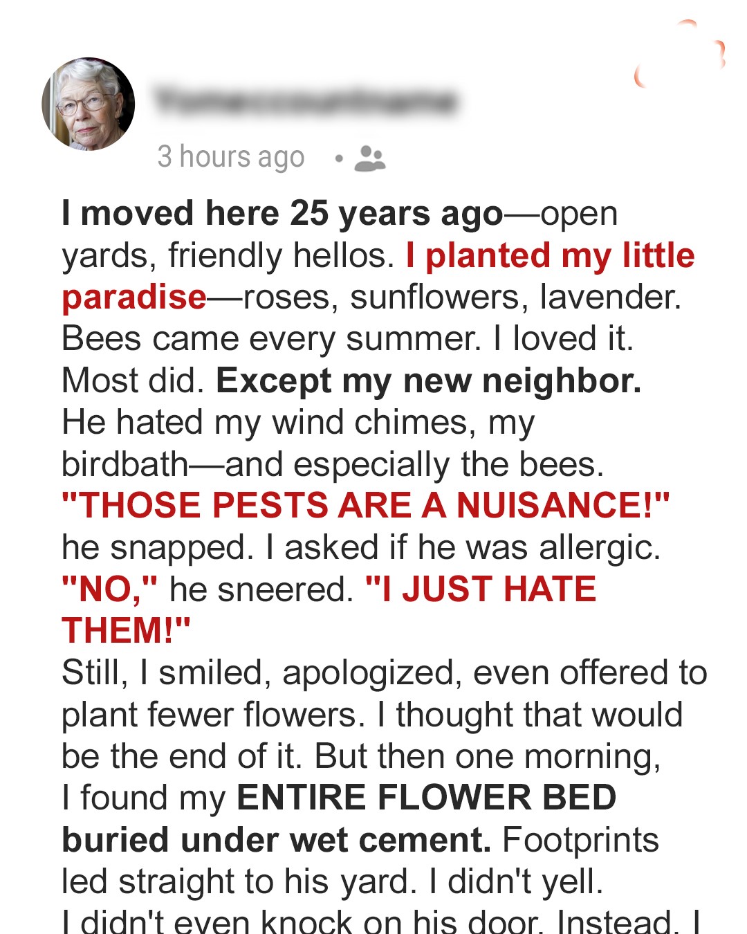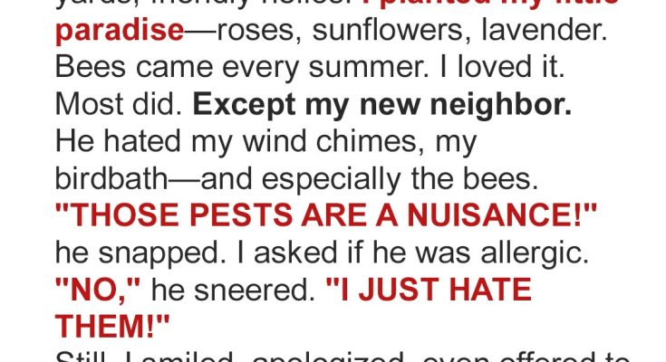 Mark moved in with a scowl and a lawnmower that ran with military precision. His neighbor offered him honey and a chance at neighborly peace, but he responded with silence, contempt, and eventually, cement. This is a story about resilience, revenge, and the sting of underestimating kind people.Neighbors come in all kinds. If you’re lucky, they’re warm or at least quietly distant. But when you’re not, they slice through your happiness, flatten your joy, and shrink the world around you—one complaint, one glare, one tightly coiled burst of anger at a time.