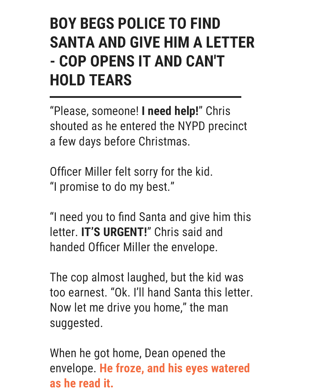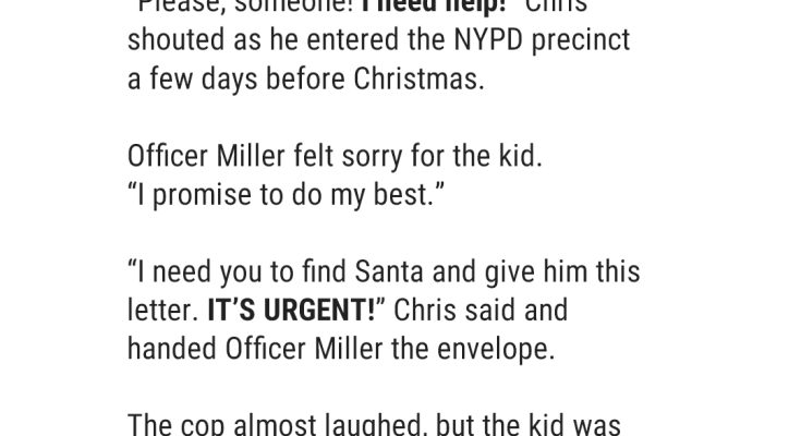 “I need you to find Santa and give him this letter. It’s urgent! It’s a matter of life or death!” Chris said and handed Officer Miller the envelope addressed to the North Pole.