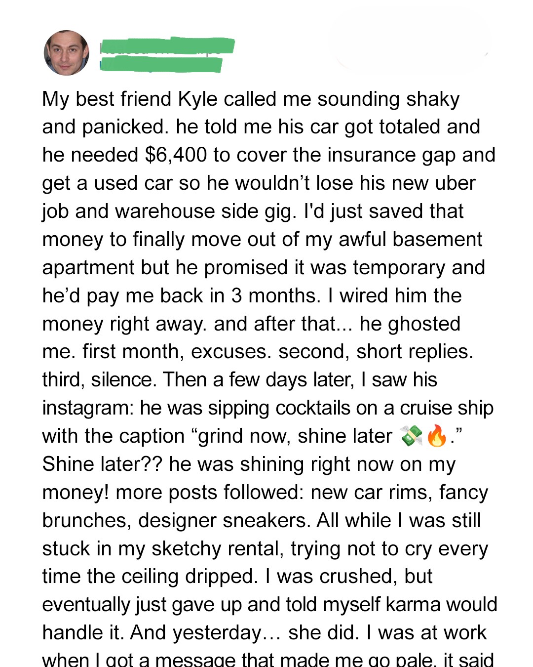 Kyle thought he could take my money and disappear into his Instagram fantasy. He thought friendship was disposable. That trust was renewable.