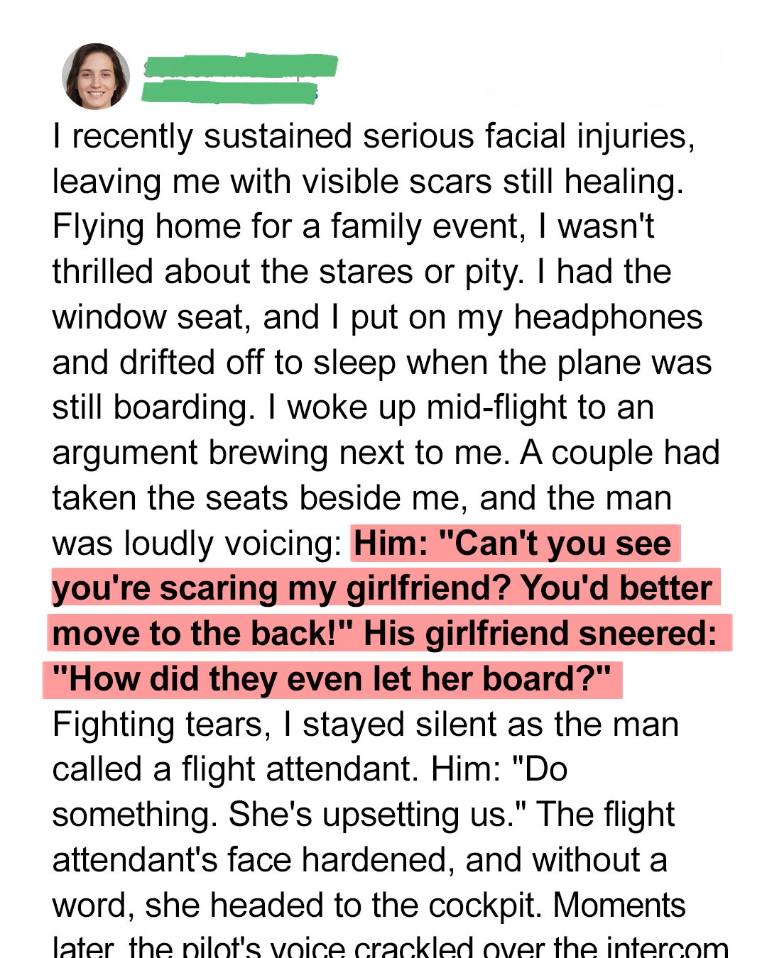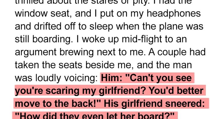 When Carla boards a flight, her healing scars become the target of a cruel couple’s disgust, igniting a tense confrontation in the cabin. What begins as silent endurance soon escalates as the couple demands action, forcing the crew to step in.The airport felt colder than usual, or maybe it was just the way people stared. I kept my head down, gripping my boarding pass like it was the only thing holding me together.
