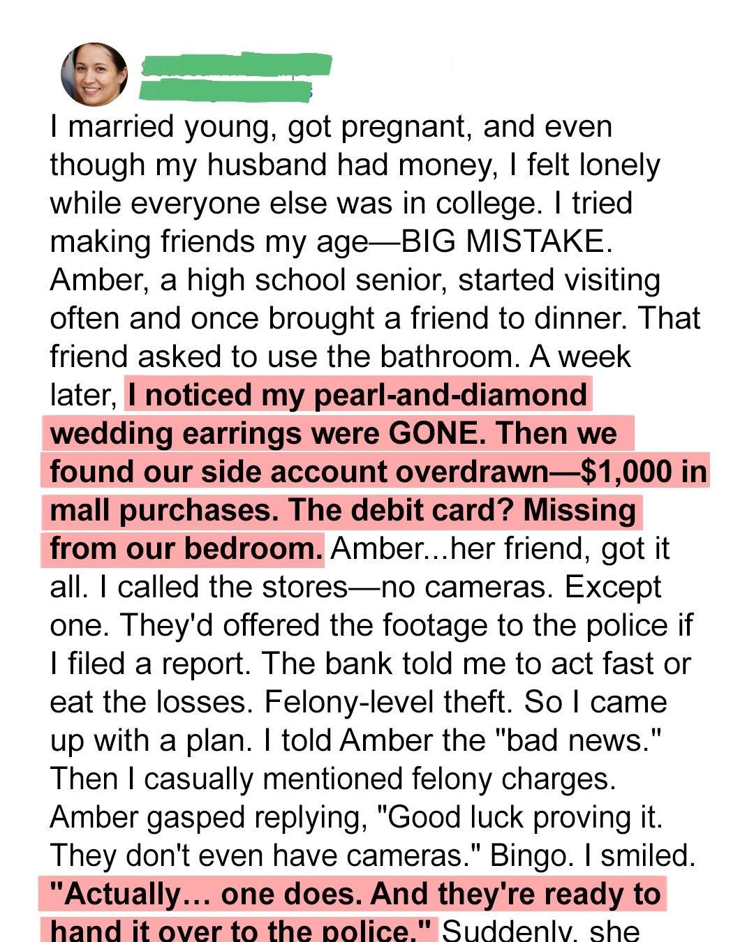 Amber stood on my porch, pale and sweating, holding a plastic sandwich bag. Inside were my pearl earrings, the missing debit card, and a diamond ring that had belonged to my great-aunt. I hadn’t even noticed it was missing.