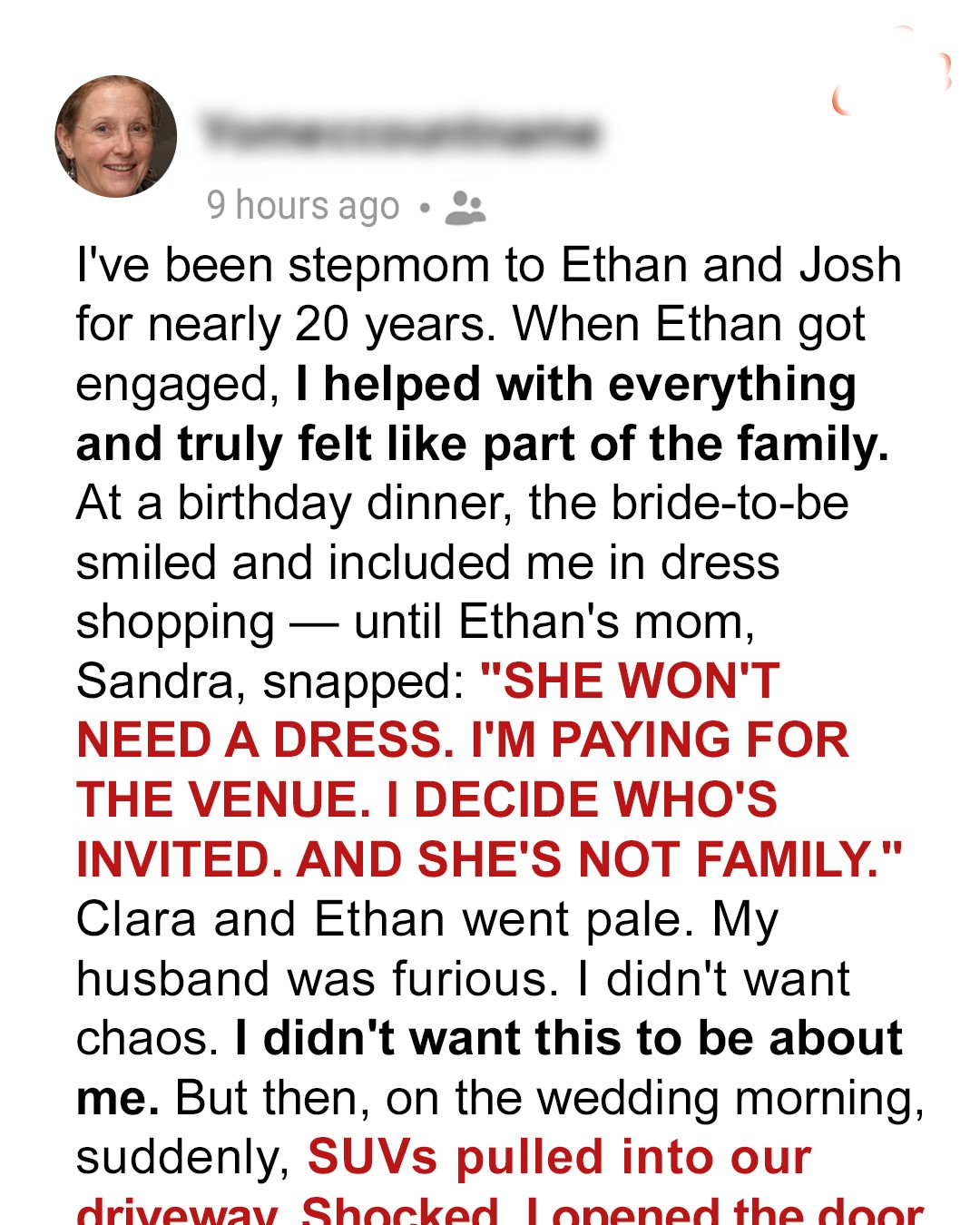 “Yes, I do,” he insisted, drawing back to look at me. “Because you deserve to hear this: You belong at my wedding. You’re family. Not because you married my dad, but because you earned that place in my life… and in my heart. You’re my mother.”