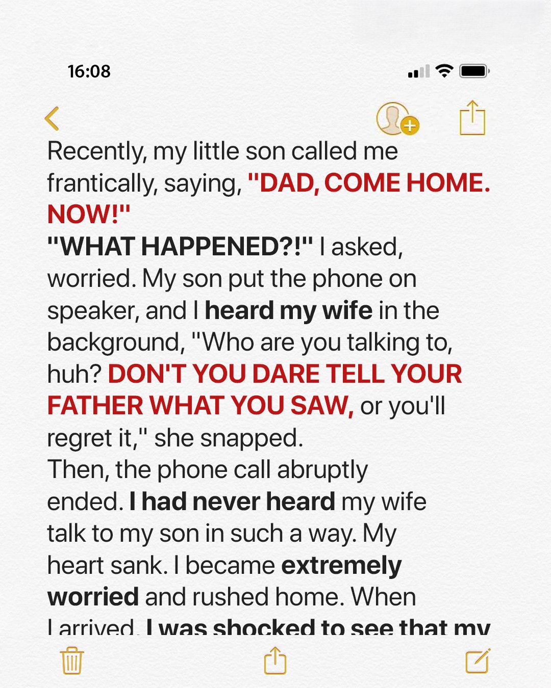 I stumbled into a chilling exchange between my wife and my son, and my world began to unravel. I raced home to confront the truth, but nothing could have prepared me for what I was about to discover.I was at work, just another normal day, when my phone rang. I answered, and my world stopped.“Dad, come home. Now!” Arthur’s voice was trembling.“What’s wrong, buddy?” My heart raced. “Is everything okay?”