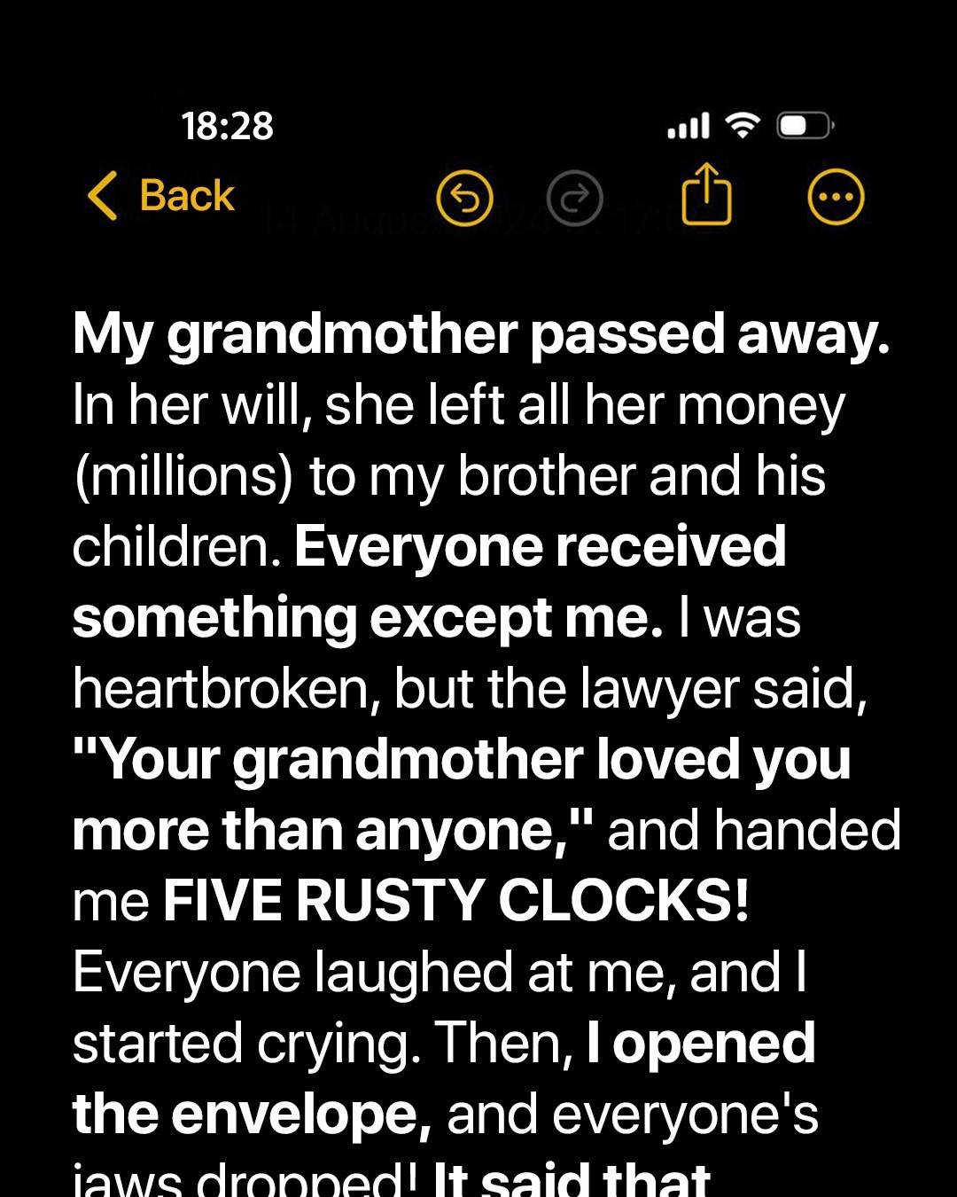 “Never underestimate these rusty, old watches! They are 100-year-old classic timepieces that belonged to my grandfather. And they are crafted from rare, exquisite metal! Each piece is worth $40,000, my dear!” began the note.