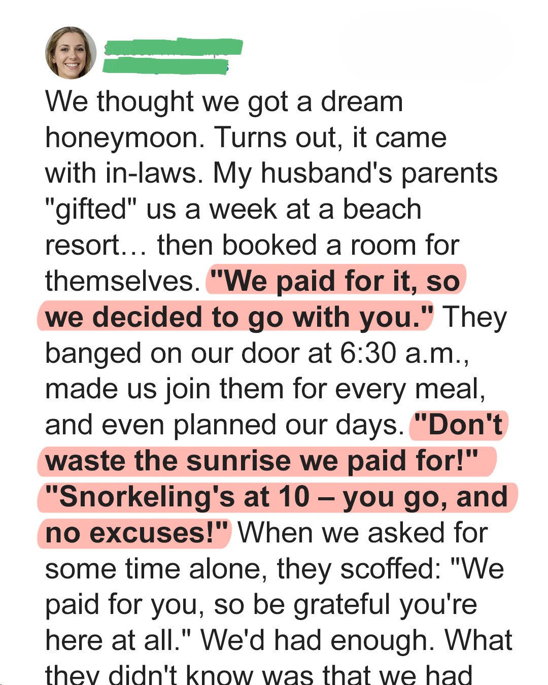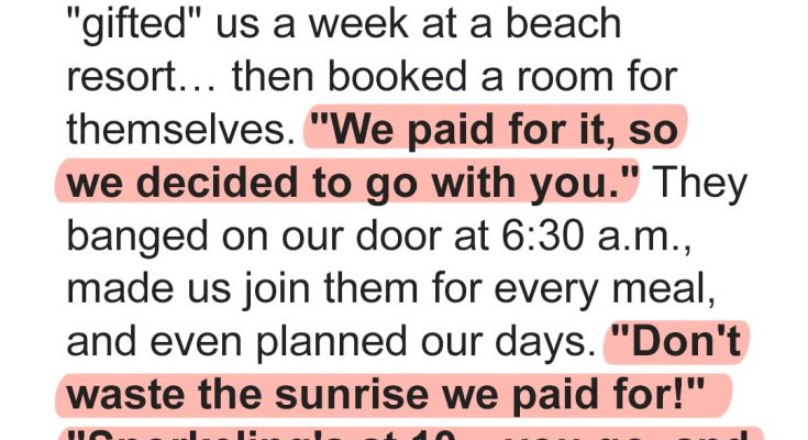 “It’s a honeymoon! One week. All-inclusive at a beach resort. This is our gift to you!” Gary beamed beside her, nodding.