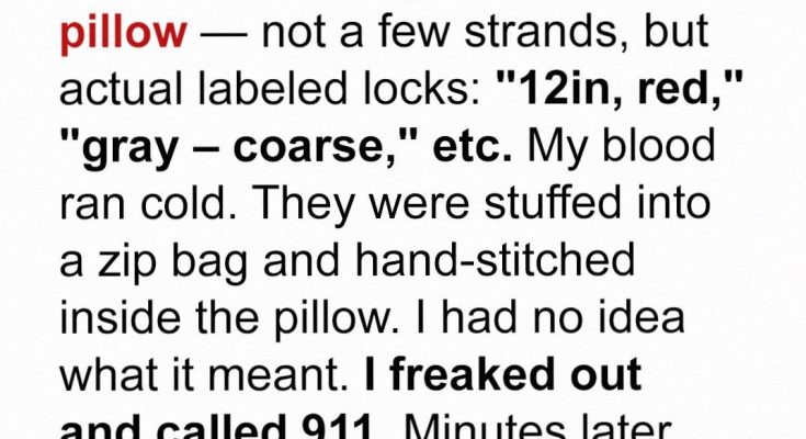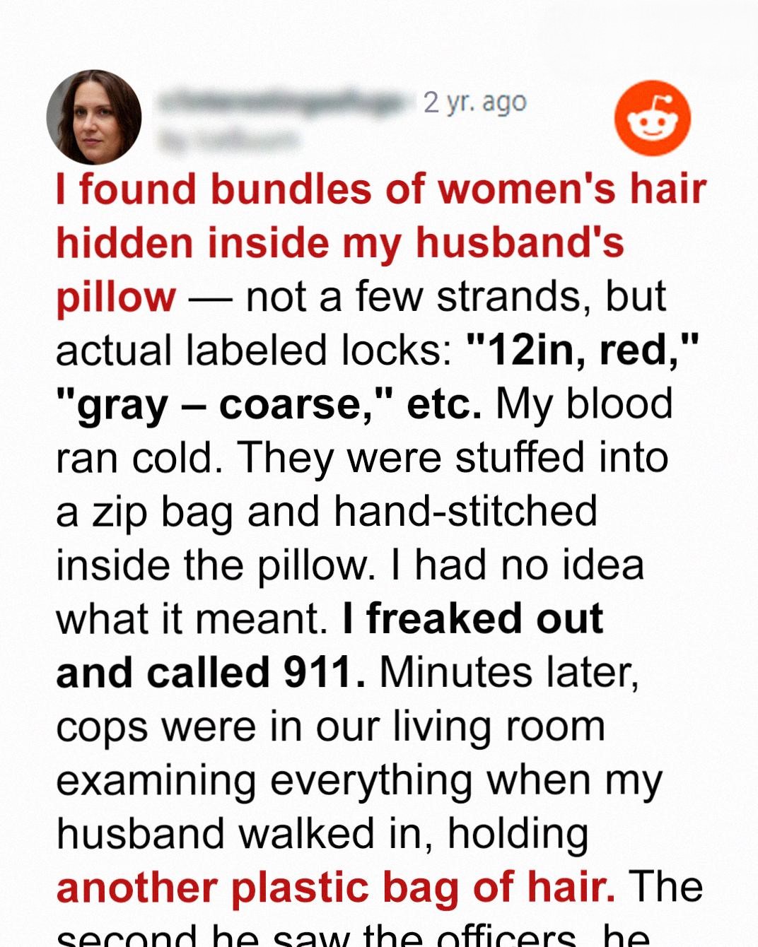 I showed them the living room. The opened pillow. The bundles of hair. The handwritten notes. They looked through everything in silence.