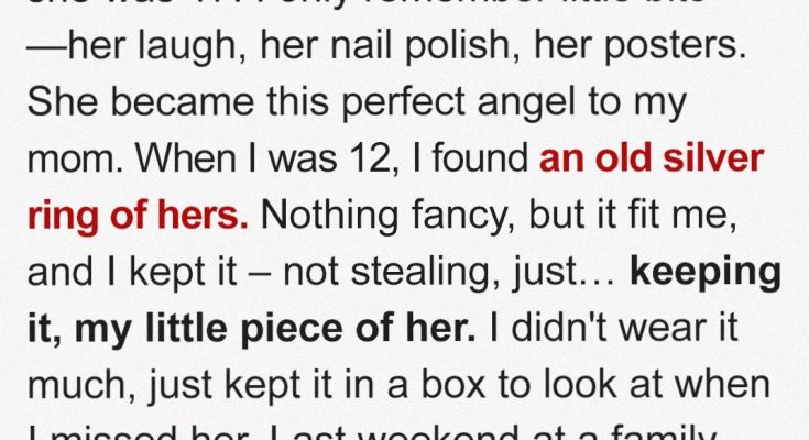 When I turned 12, Mom finally let me help sort through Alicia’s things. That’s when I found it. A simple silver ring with a tiny blue stone, tucked away in her jewelry box like a forgotten secret.