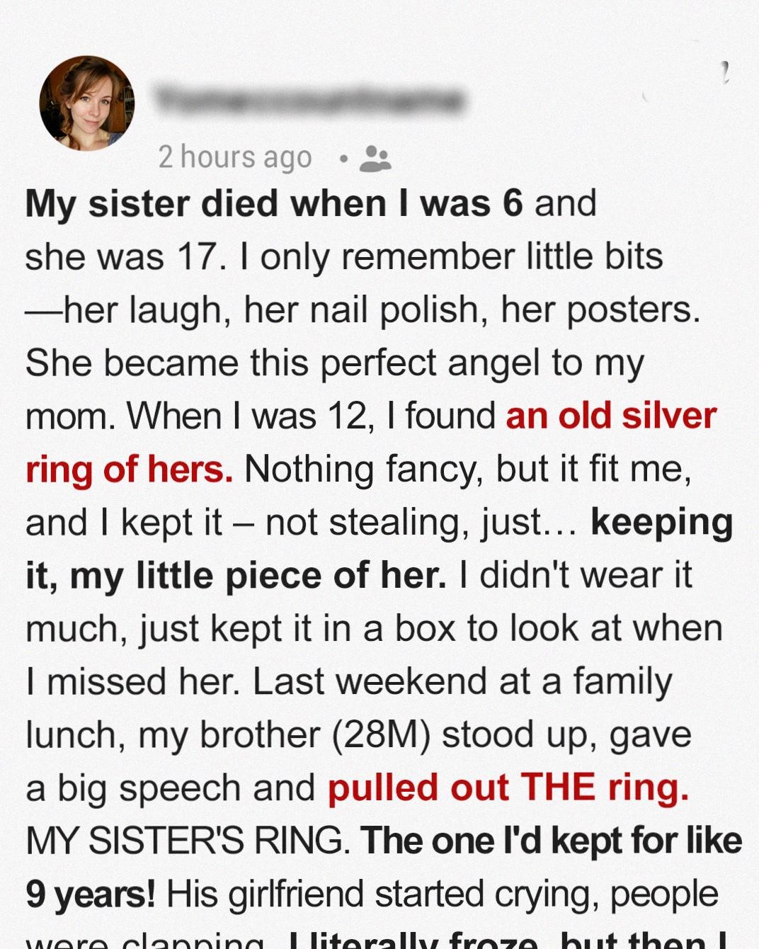 After My Dear Sister’s Death, I Kept Her Ring – Nine Years Later, I Saw My Brother Propose with It Without Asking Me