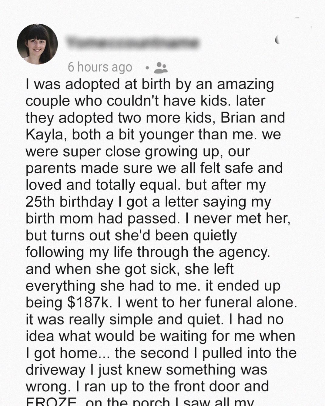 When 25-year-old Taylor inherits $187K from the birth mother she never met, she expects support from her adoptive family. But when she returns home after the funeral, she discovers a nasty surprise waiting for her.I grew up believing I was one of the lucky ones. Adopted as a baby by a couple who couldn’t have children of their own, I only knew love.
