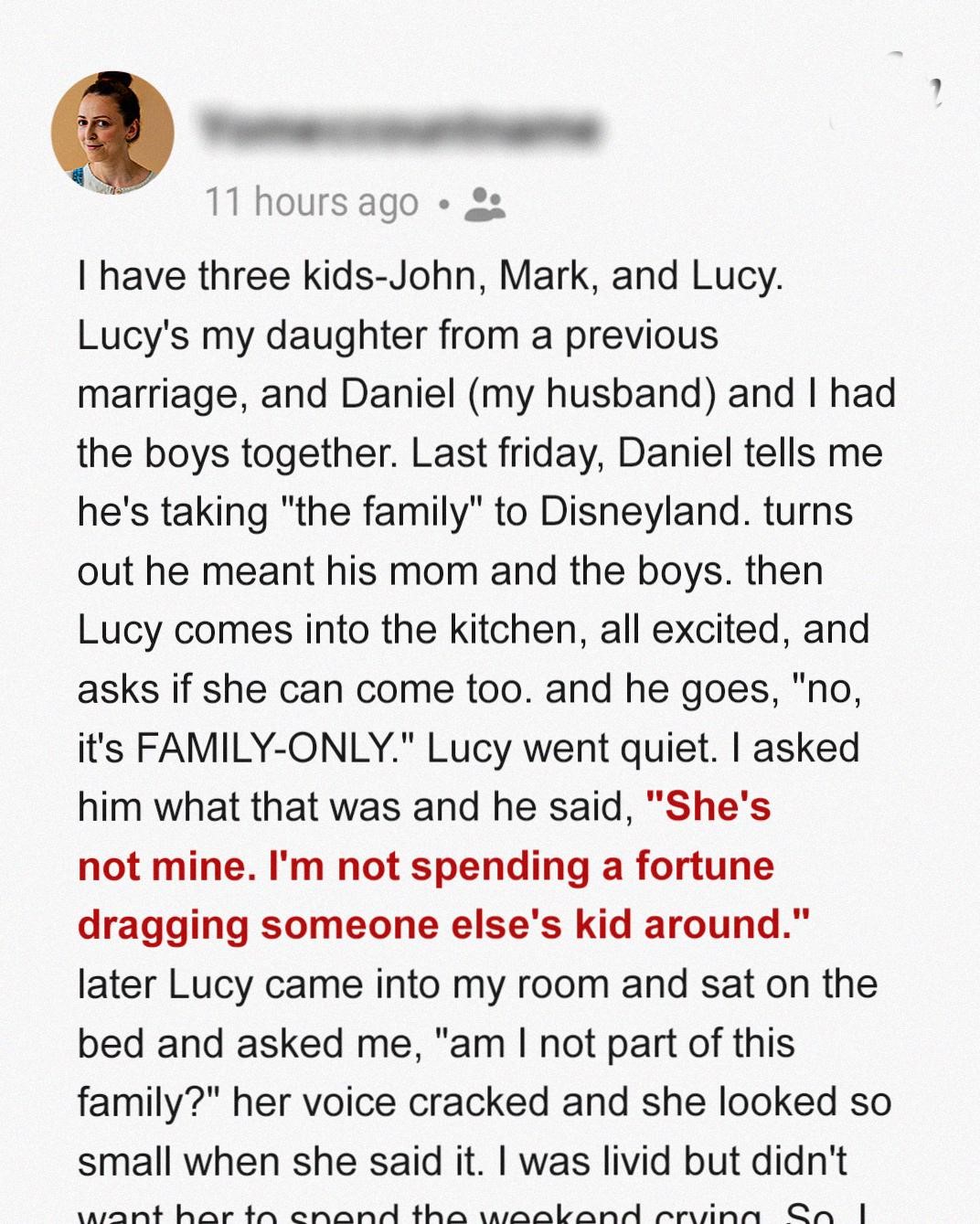 My husband and I share three children: John, Mark, and Lucy. But Lucy is my daughter from my previous marriage, while Daniel and I share John and Mark. The children’s paternity will play a major role in this story.