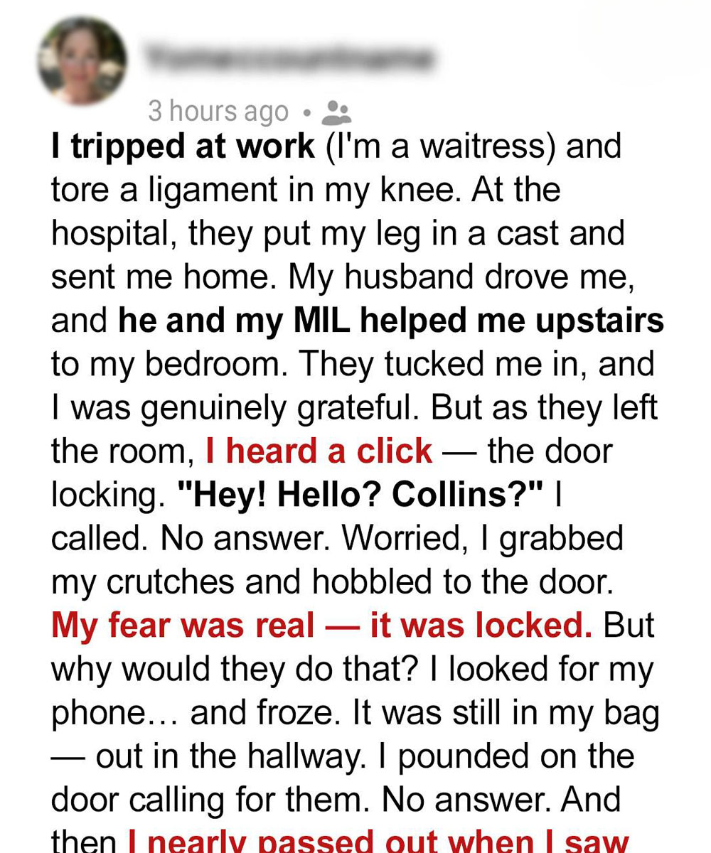 Collins promised he’d take care of me. On the first day, he and Jenna carried me upstairs, fluffed the pillows, handed me a glass of water… then locked the bedroom door from the outside.