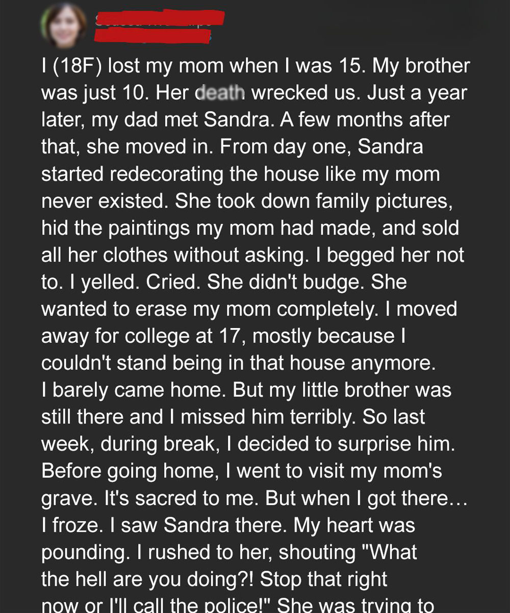 After two years away at college, I came back home burdened by the quiet ache of grief that never left me since my mother passed away from breast c.anc.er.Her memory clung to every part of me—particularly the grave where I had once found solace.However, everything changed after my father remarried Sandra, a woman whose gentle voice and swishing skirts felt foreign in the home that still echoed with my mother’s warmth.