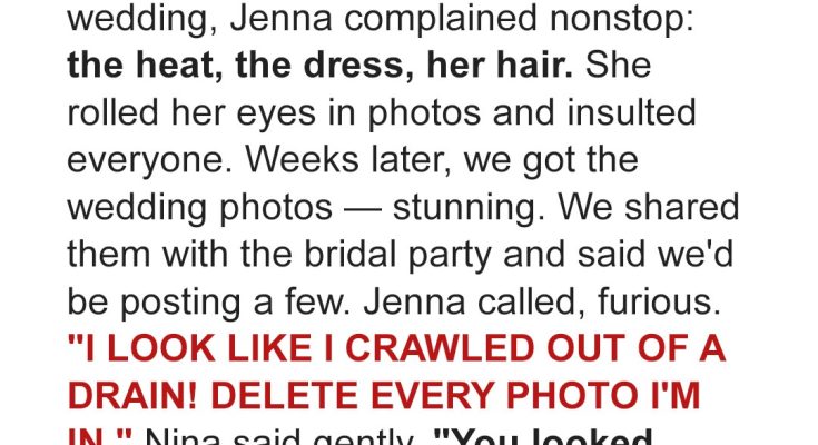 “Are you blind?” Jenna’s voice was shrill, cutting. “My hair is frizzy, the dress makes me look fat, and in half the shots I’m squinting like I’ve never seen sunlight before!”