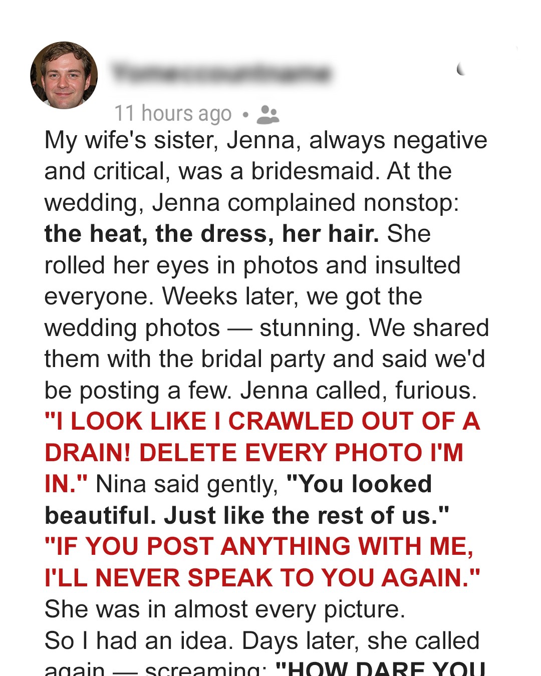 On our picture-perfect wedding day, my sister-in-law Jenna sulked through every photo and complained nonstop. Weeks later, she demanded we delete every image she was in — or else! My wife was crushed… but I had a solution, one that Jenna didn’t see coming.The morning unfolded like a dream. Clear skies stretched overhead, a light breeze drifted off the river, and the gentle scent of fresh-cut grass and wildflowers hung in the air.
