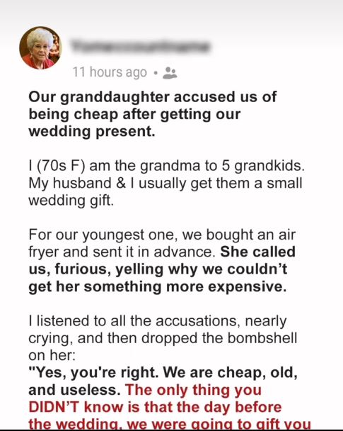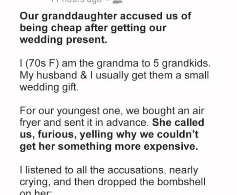 My husband and I bought our granddaughter a wedding gift from her registry. She reached out and accused us of being cheap after getting the wedding present. Now, she is upset and threatens to cut us off because we didn’t give her the cash gift that we presented to each of our grandkids a day before their wedding.I’m in my 70s, a proud grandmother to five amazing grandkids: three women and two men. I adore my grandkids and often show up for them emotionally and financially. Whenever they have celebrations or hard times, they know that they can count on me.