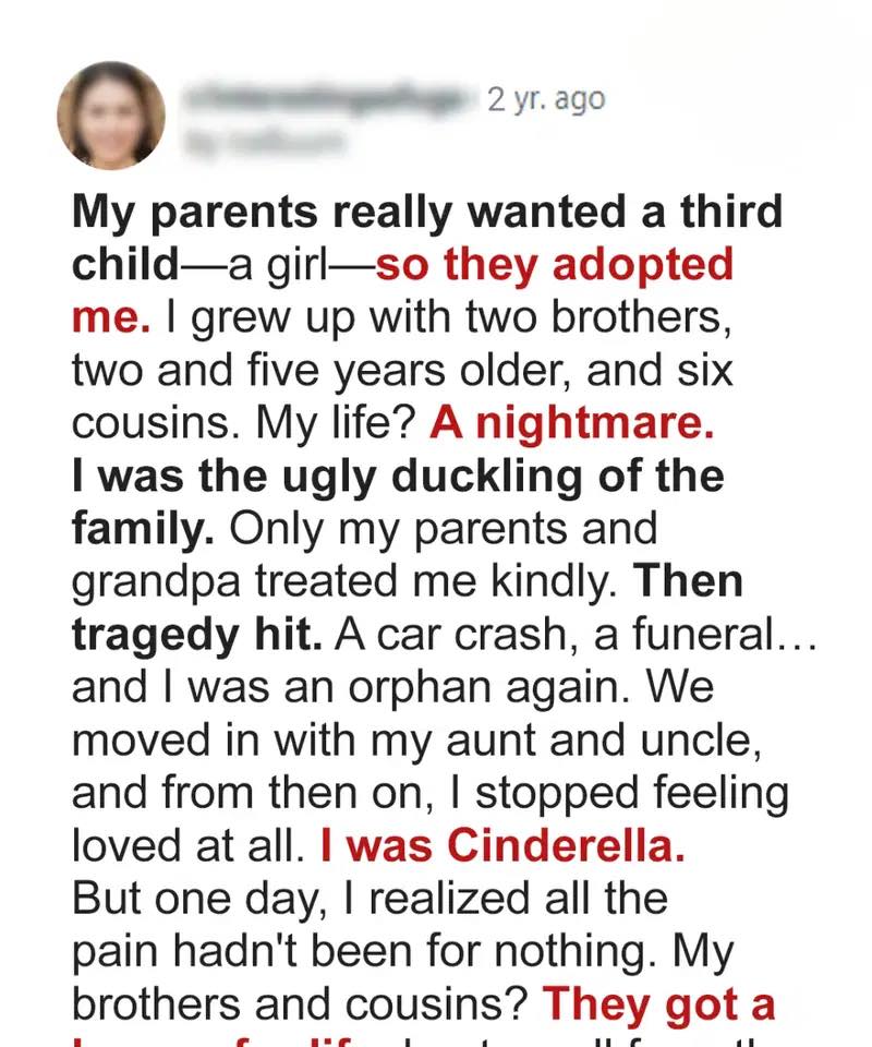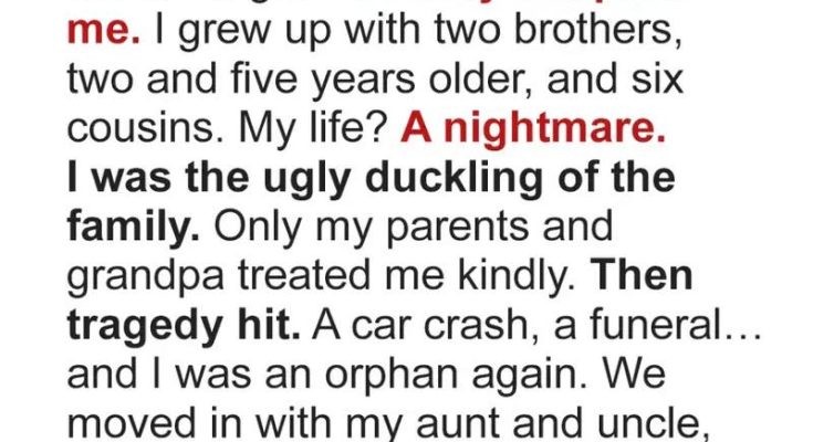 After years of trying for a third child—a daughter to “complete” the family—they adopted me.From the outside, it looked picture-perfect: two older brothers, a little girl, and a cozy home filled with love.But behind closed doors, it was far from perfect.Liam and Josh, two and five years older than me, treated me like a flaw in their perfect family portrait.When our parents weren’t around, they’d whisper things no child should hear.