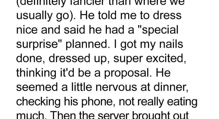 It took me three years loving Ryan, thinking our anniversary would be the night he finally proposed.He even made dinner reservations at a fancy downtown spot and told me to dress up for a “special surprise.”I curled my hair, got my nails done, wore the emerald dress he loved, and convinced myself this was it — the moment.But instead of a ring, dessert arrived with a plate that read: “Congrats on Your Promotion!” Only… I hadn’t gotten the promotion.