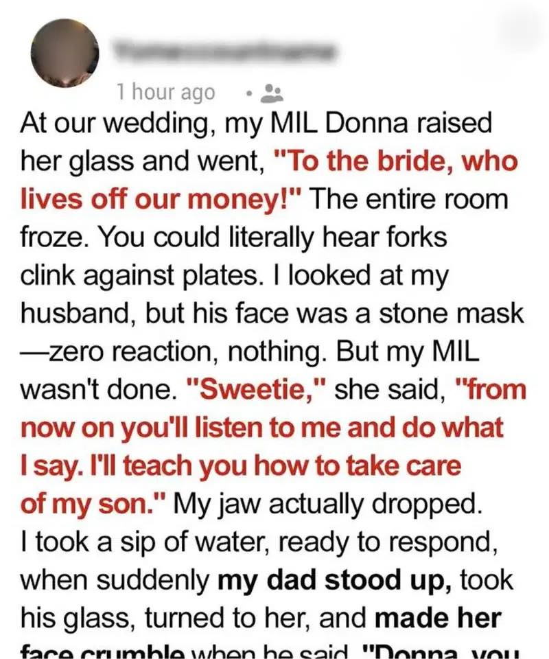 I always imagined my wedding as the happiest day of my life. Since childhood, I’d pictured the dress, the flowers, the music, the promises.And for the most part, it was everything I hoped for. The ceremony was lovely, the food got compliments, and the venue looked like a dream. But I never imagined what would unfold during the speeches.It all shifted when my mother-in-law, Donna, stood to give her toast. She tapped her glass, smiling sweetly as she stood up. Then, her lips curled into a smirk and she said, “Let’s raise a glass to the bride… who depends on our money!”