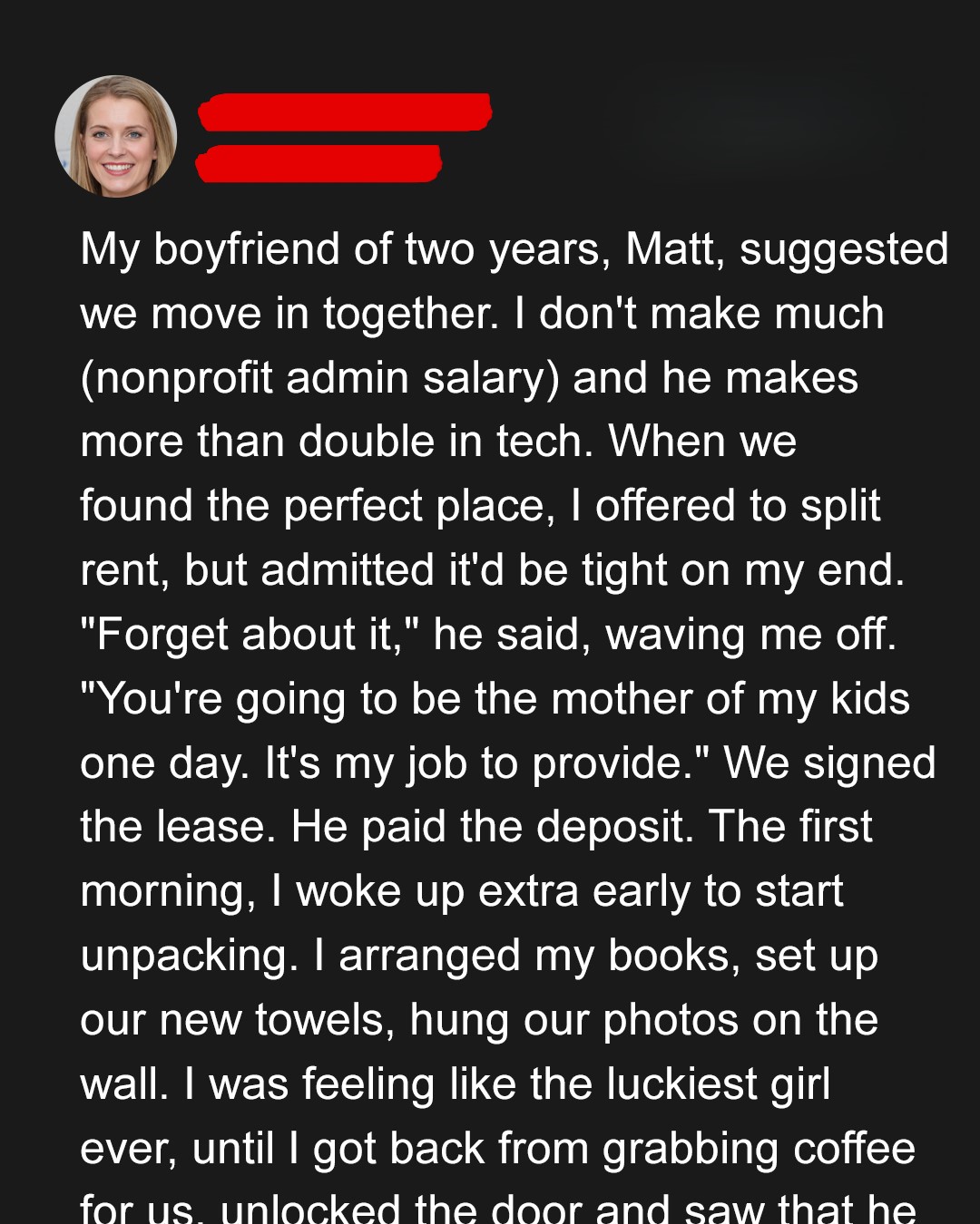 Soon, we found a cozy two-bedroom apartment with hardwood floors and a small balcony. Matt paid the deposit, signed the lease, and I started imagining our perfect little life together.
