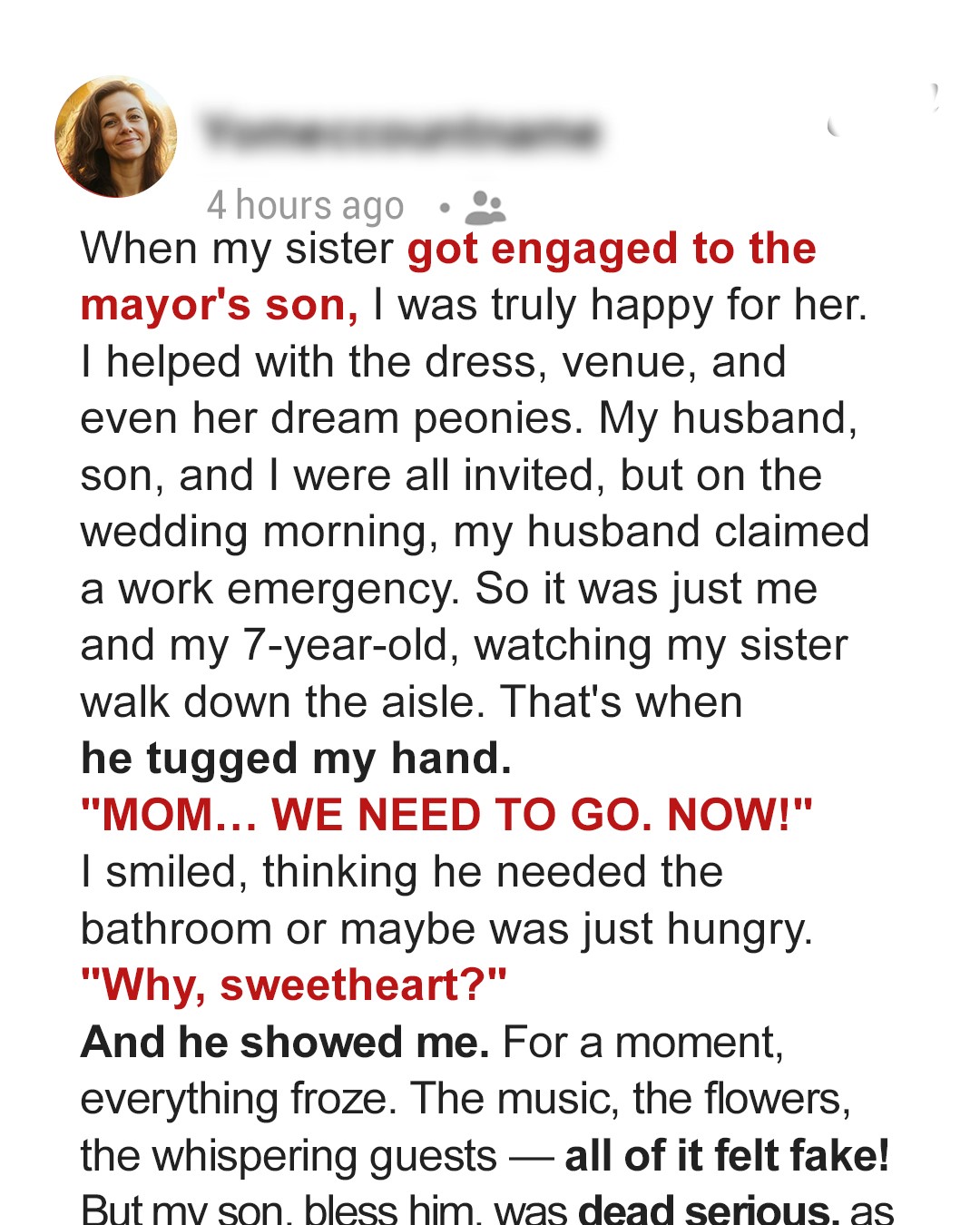 They say blood is thicker than water, but nobody tells you what happens when that blood turns into poison. My sister was moments from saying “I do” when my son tearfully said we should leave. I didn’t understand what was wrong until he showed me something that brought the whole church to a standstill.I’m Kylie, 35, a small-town mom.Lily, my younger sister, always had a knack for stealing the spotlight. And maybe she didn’t mean to, but when our parents looked at her, they saw perfection. When they looked at me… well, they saw what was left.