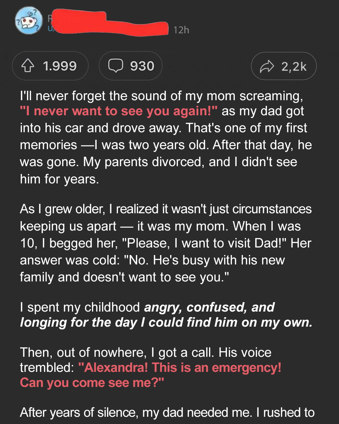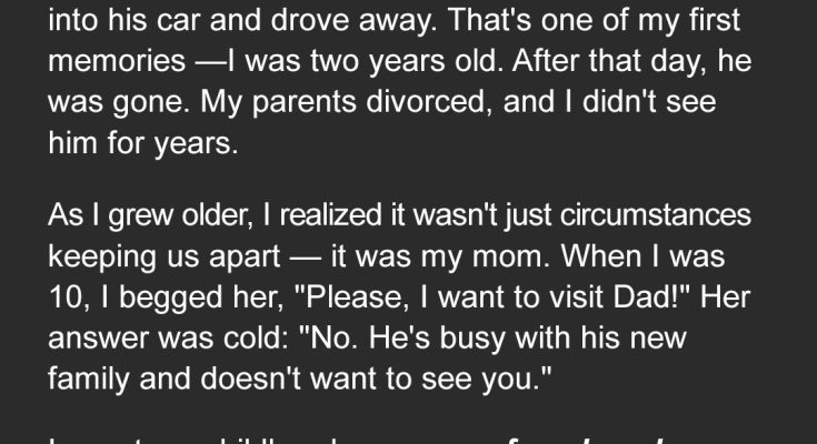 “Don’t talk back to me, Alexandra! Your father left us and doesn’t deserve to have a relationship with you now,” Mom said. I thought that was unfair, but I was still just a child.