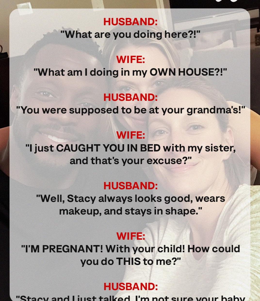 “That’s all you have to say?” I asked, my eyes filling with tears. “I just caught you in bed with my sister, and that’s your excuse?”
