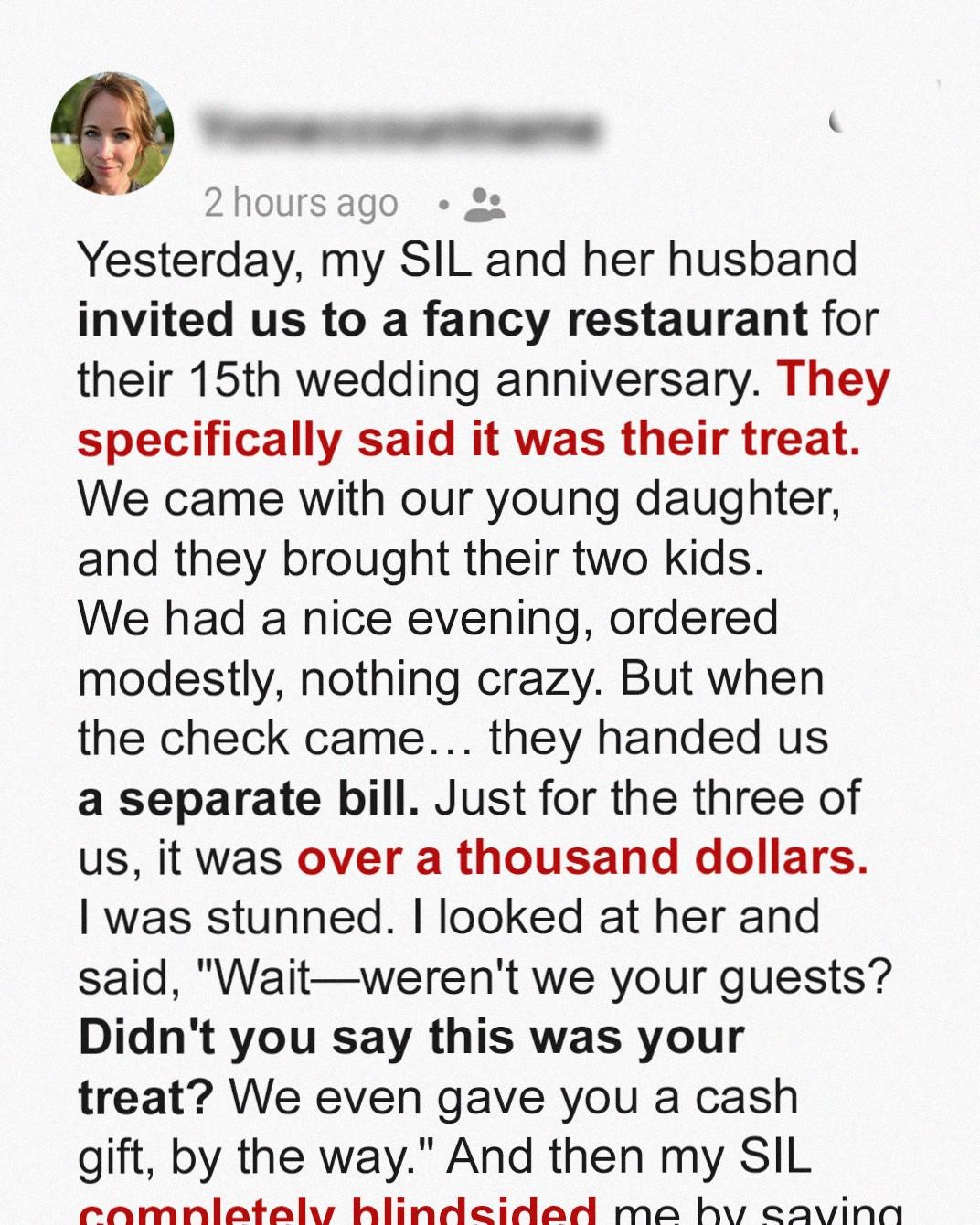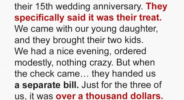 When Sabine’s sister-in-law invites her family to a lavish anniversary dinner, it sounds like a heartfelt gesture, until the bill arrives. What follows is a quiet unraveling of trust, family politics, and a long-overdue lesson in boundaries. Sometimes, the only way to be heard… is to go public.Yesterday was Amanda and Jeff’s fifteenth wedding anniversary.She messaged me last week:“Sabine! We’d love for you, David, and Ella to join us for dinner on Saturday! It’s our treat, honey. Just bring yourselves.”Look, it sounded sincere.