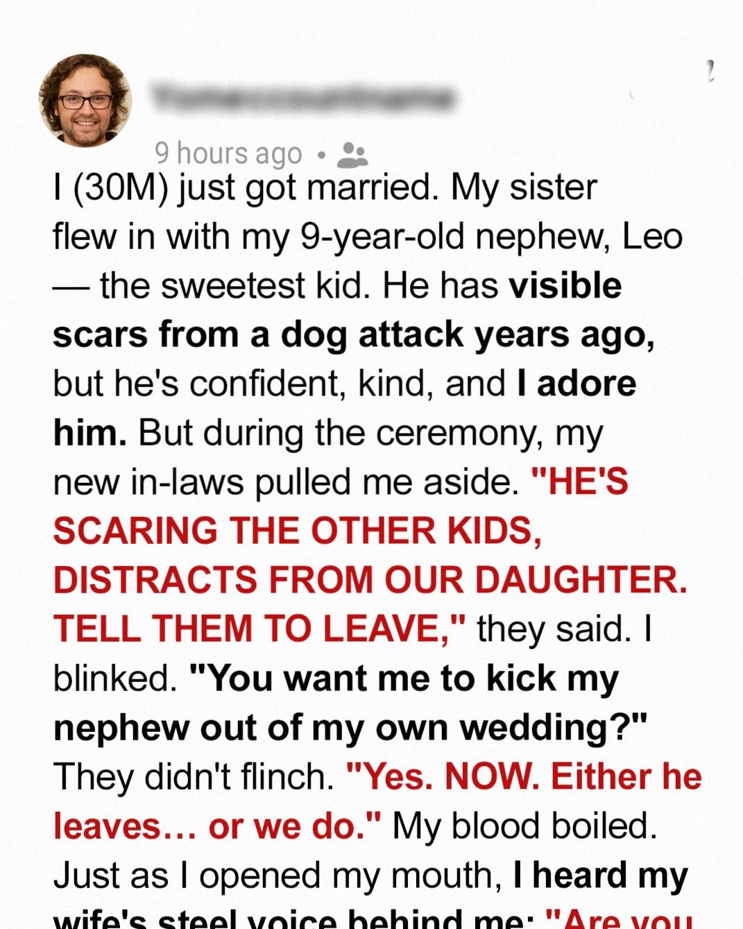 But it was my bride’s voice, full of steel, that spoke first. “Are you seriously asking Jack to kick his nephew out of our wedding? A child?!”