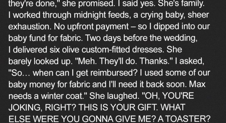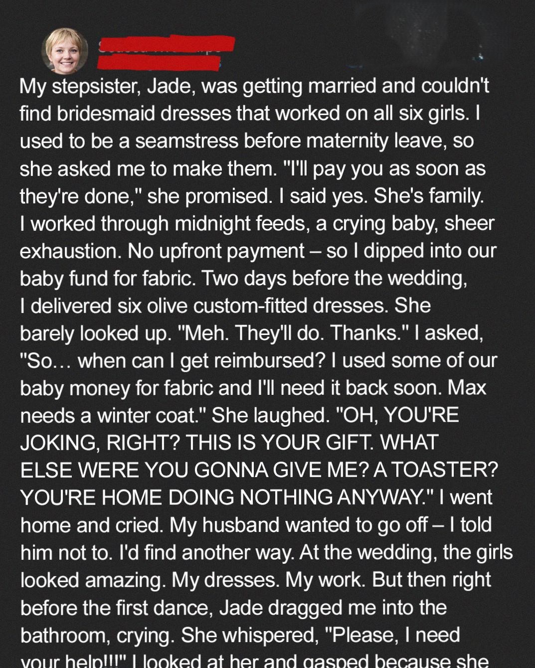 “I treated my stepsister like she was disposable. Like her talent meant nothing. I promised to pay her for making six custom bridesmaid dresses, then told her it was her gift to me instead. I used money she’d set aside for her baby to buy materials, then acted like she should be grateful for the work.”