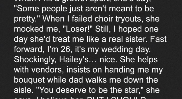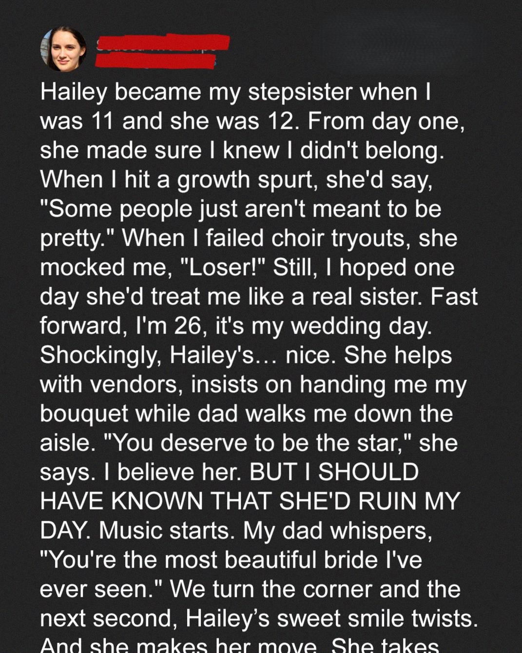 My stepsister resented me and never missed a chance to mock my appearance or abilities. At my wedding, she tripped me in front of 200 guests as I walked down the aisle. I thought no one noticed. But the next morning, my dad called her upstairs and said something that made her cry.I was 11 when my dad, Roger, married Hailey’s mom. Hailey was 12 then. From the moment she walked into our house, she made it clear that I was the unwelcome guest at my own family dinner… and my home.But nothing could’ve prepared me for what she’d do 15 years later… in front of 200 people.