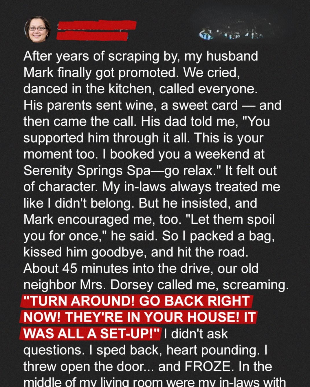 My FIL Insisted I Go On a Spa Weekend He Paid For – Halfway There, My Neighbor Called Screaming, ‘It Was All Their Plan! Go Back Now!’