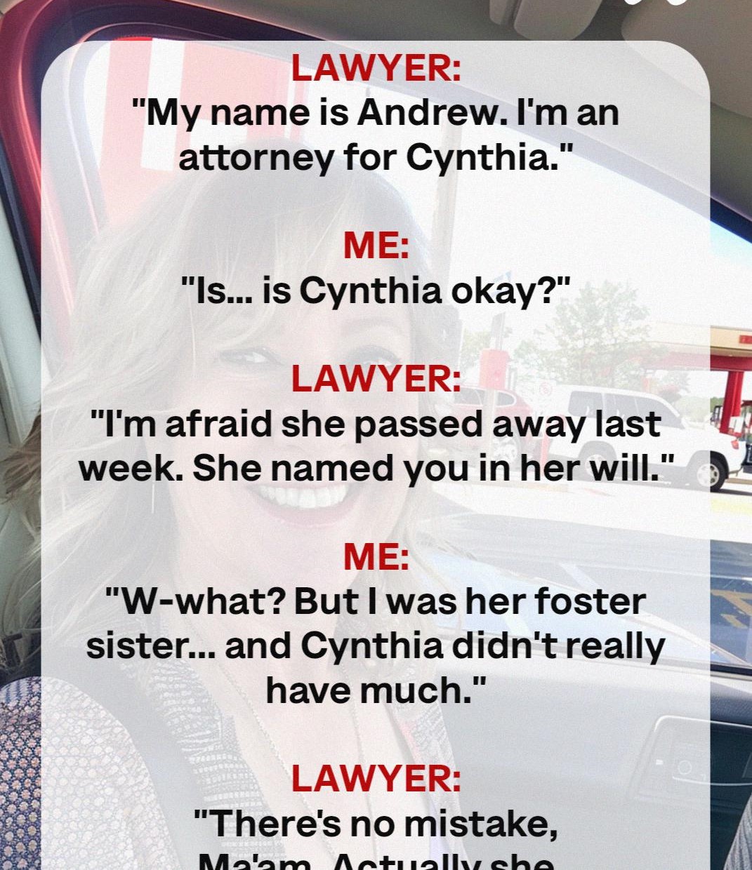 “I’m afraid she passed away last week. She named you in her will. I’ll need you to come in for the reading.”
