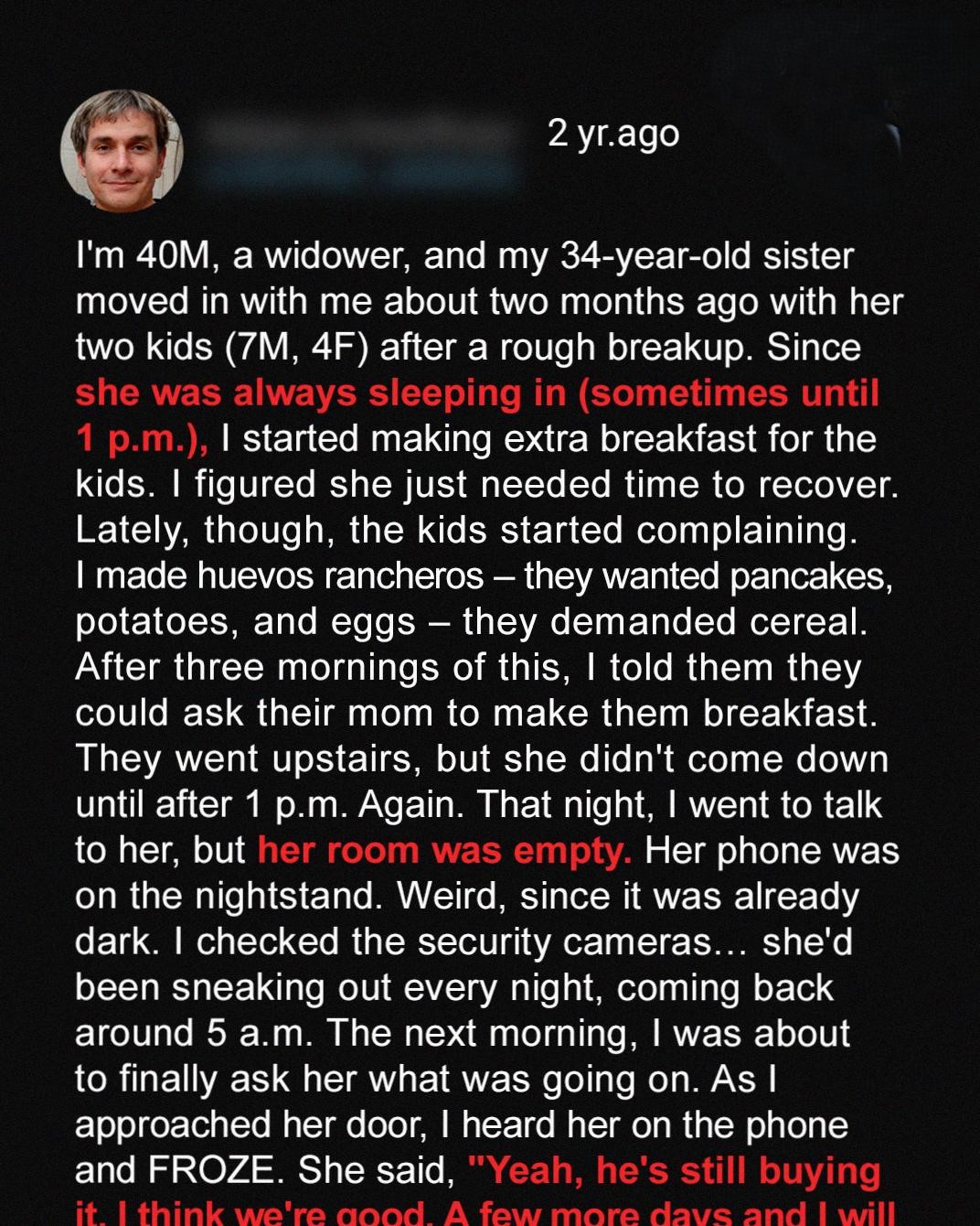 So I built a quiet life. Mornings were mine. Nights too. It wasn’t exciting, but it was peaceful. Until two months ago, when Jenny, my 34-year-old sister, called just after midnight. She was crying so hard I couldn’t even understand her at first.