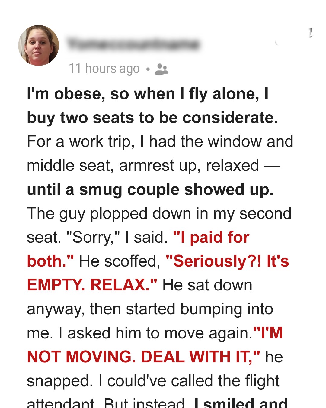 I could’ve called the flight attendant… or made a scene. Instead, I just smiled.