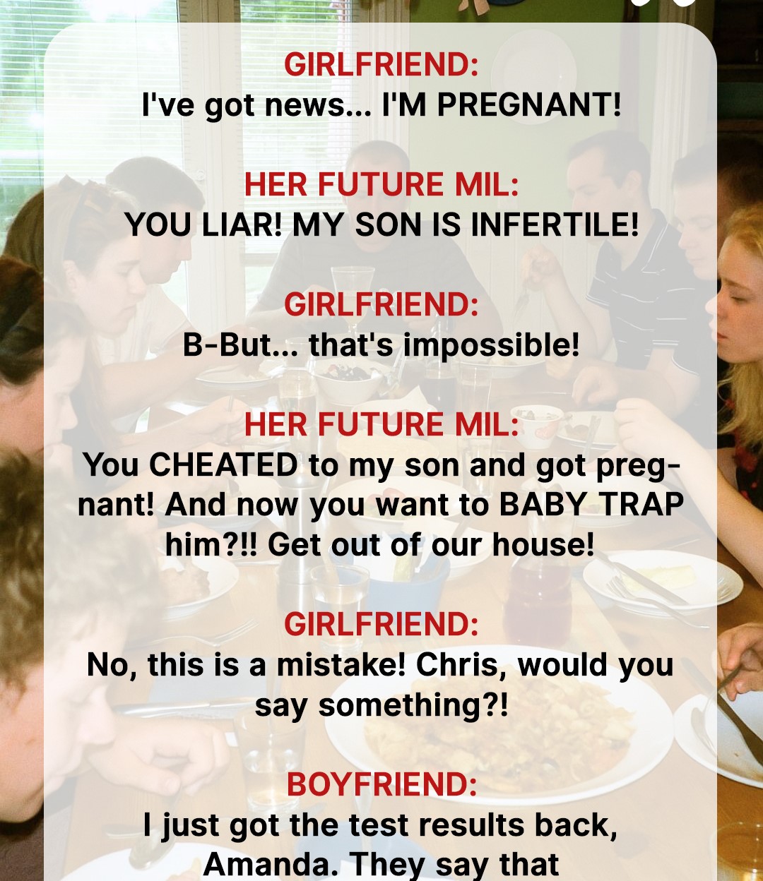 Chris’ parents didn’t accept his relationship with Amanda. When she announced her pregnancy at the dinner, they rushed to call her a cheater because they had just gotten some shocking medical results. Their lives would never be the same.“I just want to get this over with,” Chris sighed in front of his parents’ house door.“They’re your parents, honey. We want them to finally accept me and come to our wedding, right?” his wife, Amanda, caressed his arms.