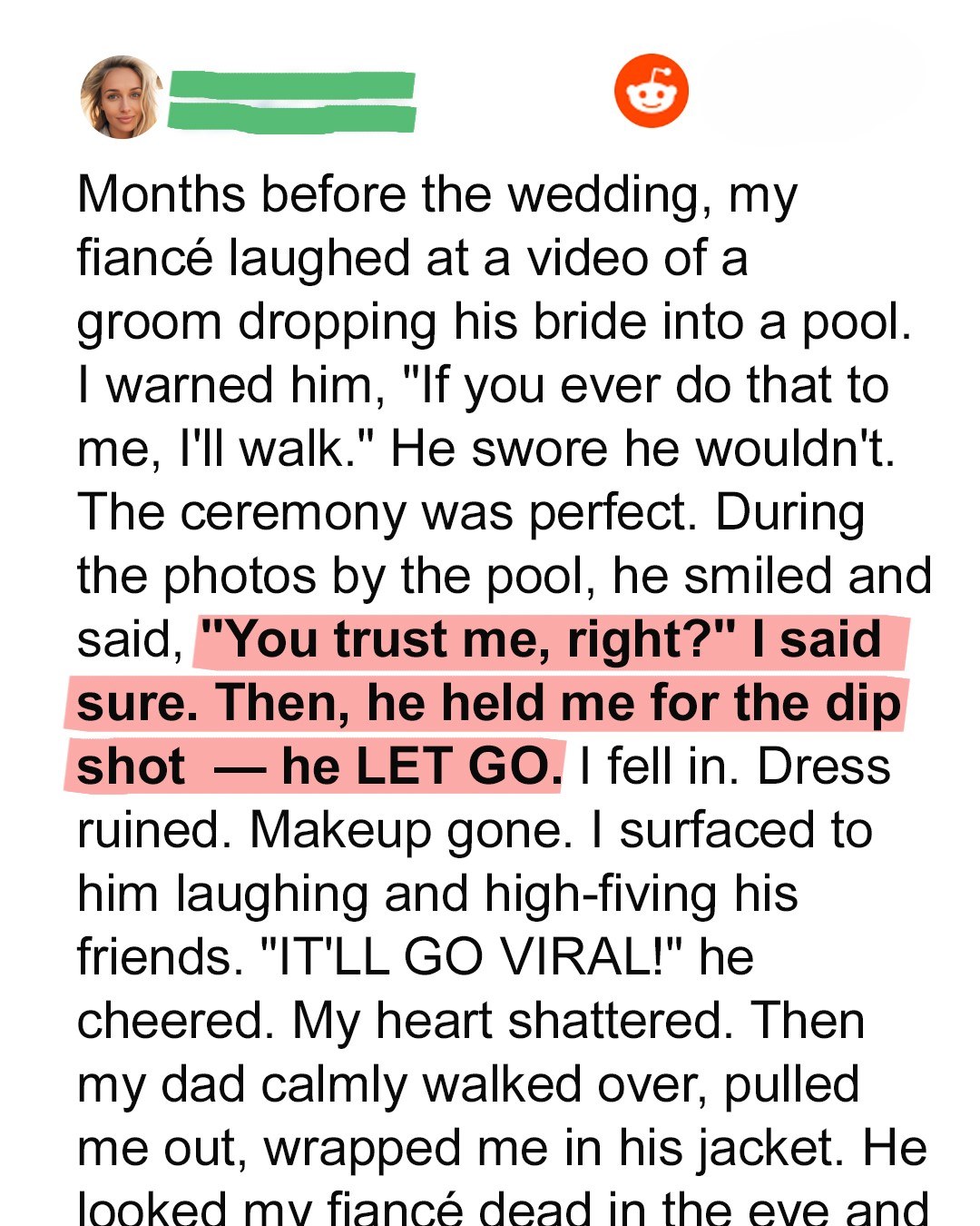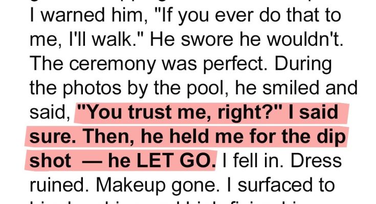 When Claire’s wedding takes a sharp turn from picture-perfect to unforgivable, one moment shatters everything she thought she knew about love, trust, and the man she was about to marry. But sometimes, it’s the quiet strength of those who love us most that makes the loudest statement. And this time? The fallout is unforgettable.A few months before the wedding, Dylan showed me a video on his phone. We were in bed, the glow of the screen flickering over our hands as he laughed uncontrollably at a clip of a groom tossing his bride into a swimming pool during their wedding shoot.