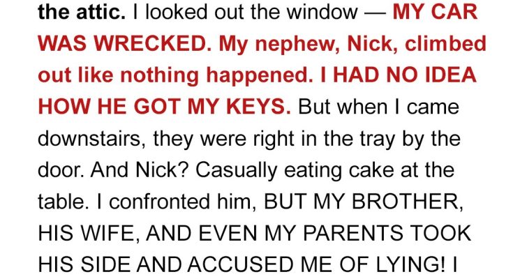 “I wasn’t the one driving,” I said. “My nephew, Nick, took my car without permission. I had no idea until I saw the damage. He doesn’t have a license.”