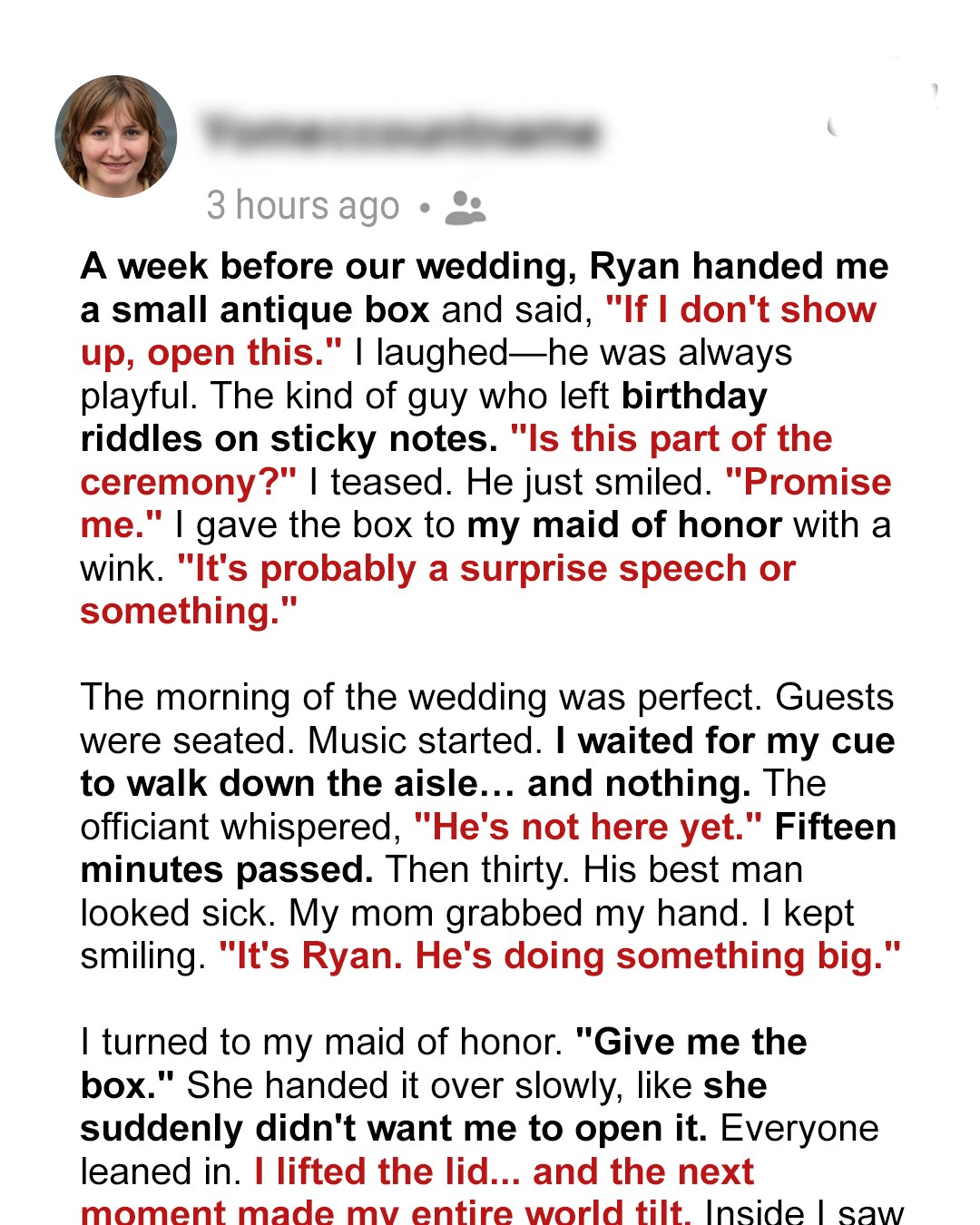 On the morning of her wedding, Tessa opens a box her fiancé told her to open only if he didn’t show up. As the ceremony stalls and the crowd begins to murmur, she unlocks more than just a secret… she uncovers a truth that will reshape everything she thought she knew about love, loss, and herself.Ryan was always the poetic type.Not the sonnet-reciting, rose-scattering kind. No. He was subtle. Quiet. He liked puzzles and irony, words wrapped in meaning you didn’t catch until two days later.
