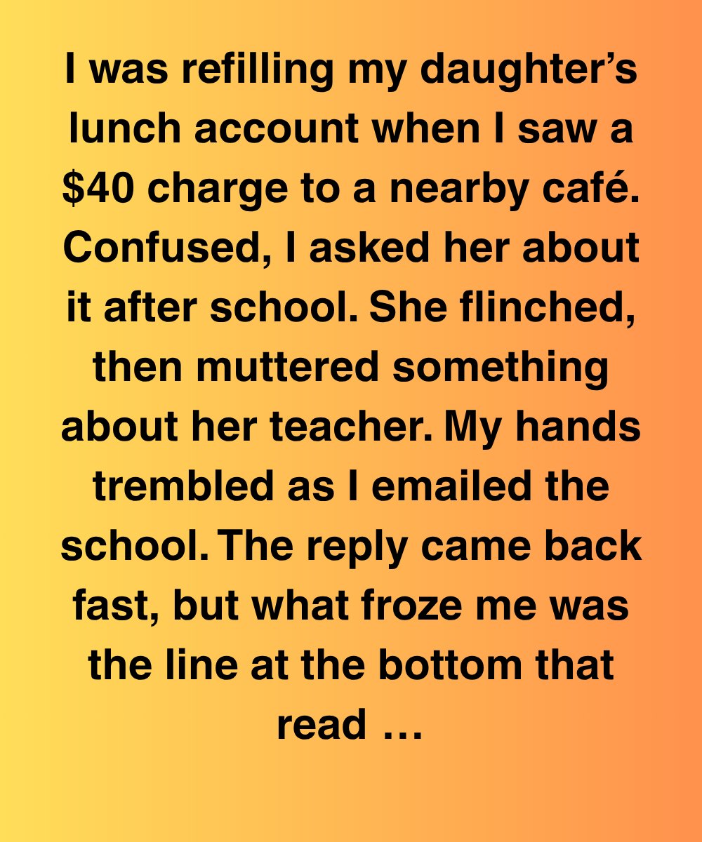 I was refilling my daughter’s lunch account when I saw a $40 charge to a nearby café. Confused, I asked her about it after school. She flinched, then muttered something about her teacher. My hands trembled as I emailed the school. The reply came back fast, but what froze me was the line at the bottom that read: “Please let me know if you’d like to discuss this in person. I believe Ms. Varela has already reached out to you.”But she hadn’t.No call. No email. Nothing.