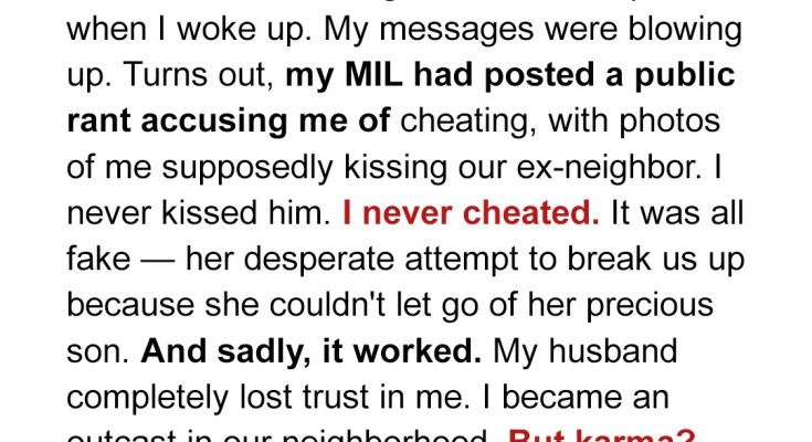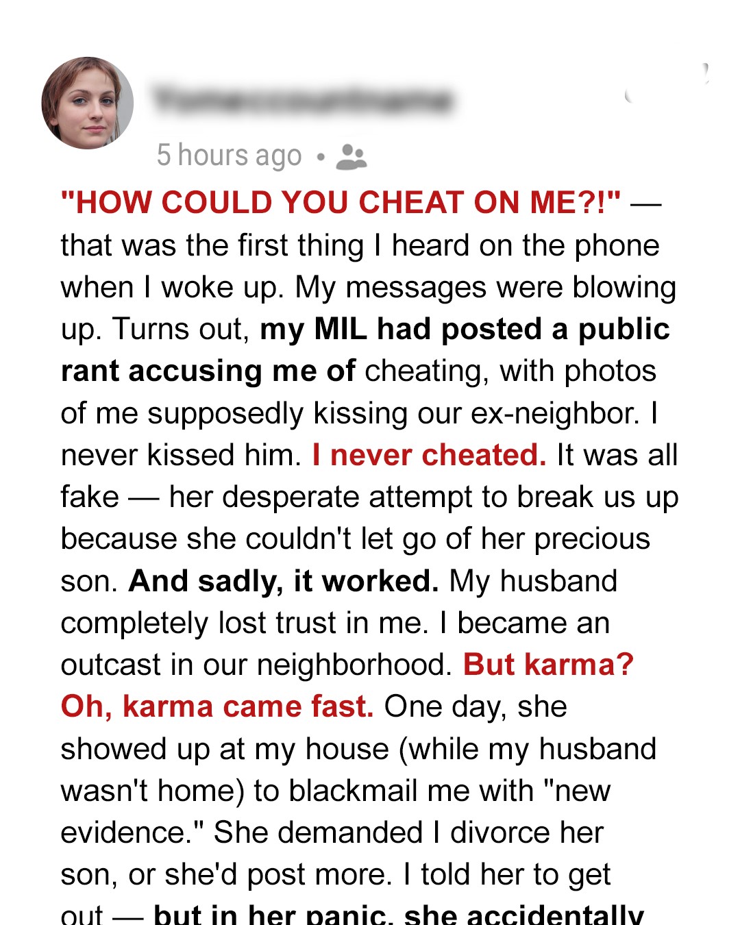 Ava’s world shatters when she wakes to her husband’s furious call — her MIL has posted fake photos online, accusing her of cheating. As neighbors turn cold and her marriage teeters, Ava must prove the truth before lies destroy everything. But karma’s watching, and it’s got receipts.I’d just crawled into bed after an exhausting night shift at the hospital when my phone started vibrating like it had a personal vendetta against my nightstand.I fumbled for it, squinting at the screen. Liam. My husband. Why was he calling me when he knew I’d just gotten home?“Hello?” My voice came out like sandpaper.“HOW COULD YOU CHEAT ON ME?!”