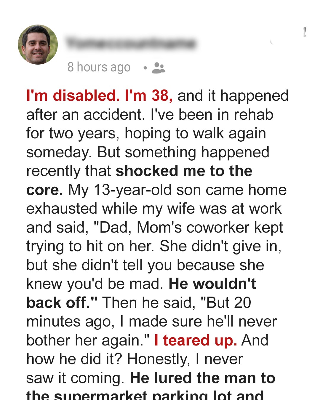 When my 13-year-old son came home looking exhausted and told me he’d “handled” my wife’s persistent coworker who wouldn’t stop hitting on her, I never expected what he’d actually done. What this kid pulled off was so brilliant and devastating that it left me speechless.My name is Tim, and I’m 38 years old.Before my accident, I was what you’d call a man’s man in every sense of the word. I was built like a brick wall. Six-foot-two, and 220 pounds of solid muscle.