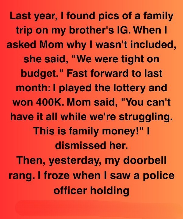 Last year, I came across photos of a family vacation on my brother’s Instagram. When I asked my mom why I hadn’t been invited, she casually said, “We had to keep costs down.” It stung, but I let it go.Fast forward to last month: I won $400,000 in the lottery.When my mom found out, her tone changed completely. “You can’t enjoy all that while your family’s suffering,” she said. “That money belongs to us.” I brushed it off, not wanting to engage in an argument.