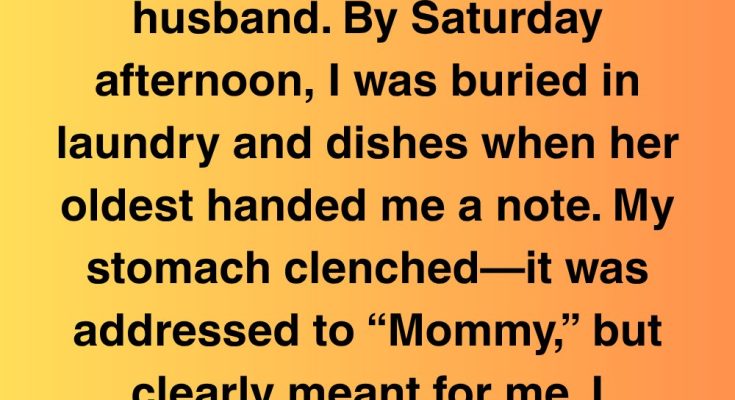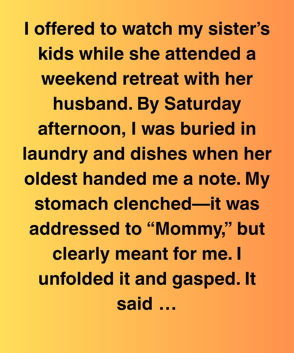 I offered to watch my sister’s kids while she attended a weekend retreat with her husband. By Saturday afternoon, I was buried in laundry and dishes when her oldest handed me a note. My stomach clenched—it was addressed to “Mommy,” but clearly meant for me. I unfolded it and gasped. It said;“Can I live with you instead? Please don’t tell Mom. I’ll be good. I just want to feel safe.”I stared at the handwriting, uneven and unsure, from nine-year-old Lily. My hands trembled as I read it again. I could barely breathe. “Feel safe”? What did that even mean in her little world?