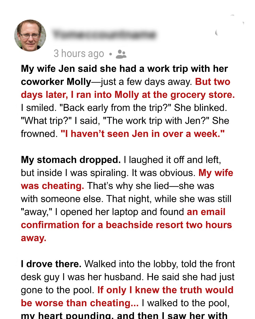 My hands shook as I opened her second laptop. The password was our anniversary date… she’d never changed it. Her email loaded, and there it was: a confirmation from Sunset Bay Resort. It wasn’t a conference center. It was a romantic getaway spot just two hours north.